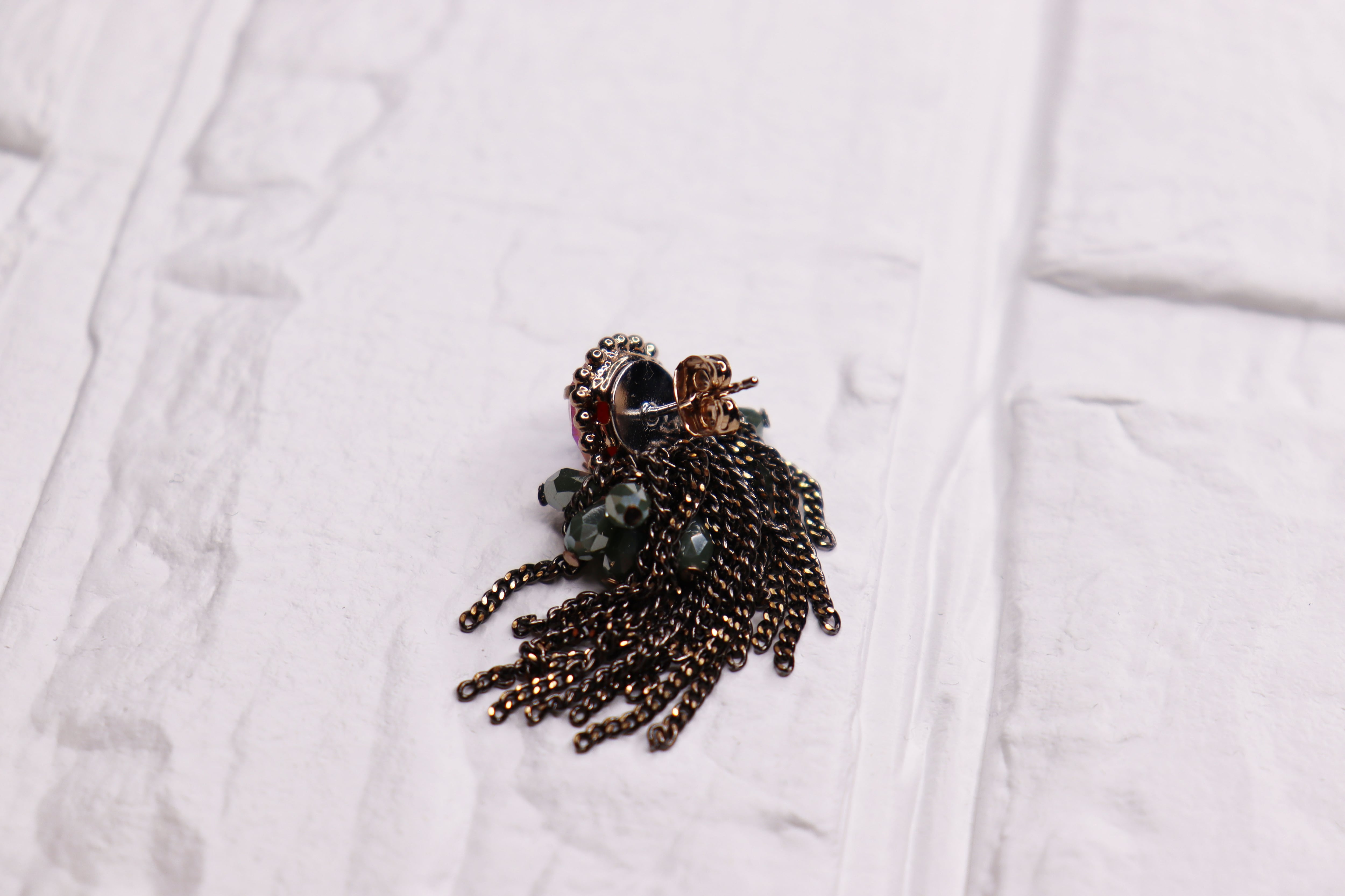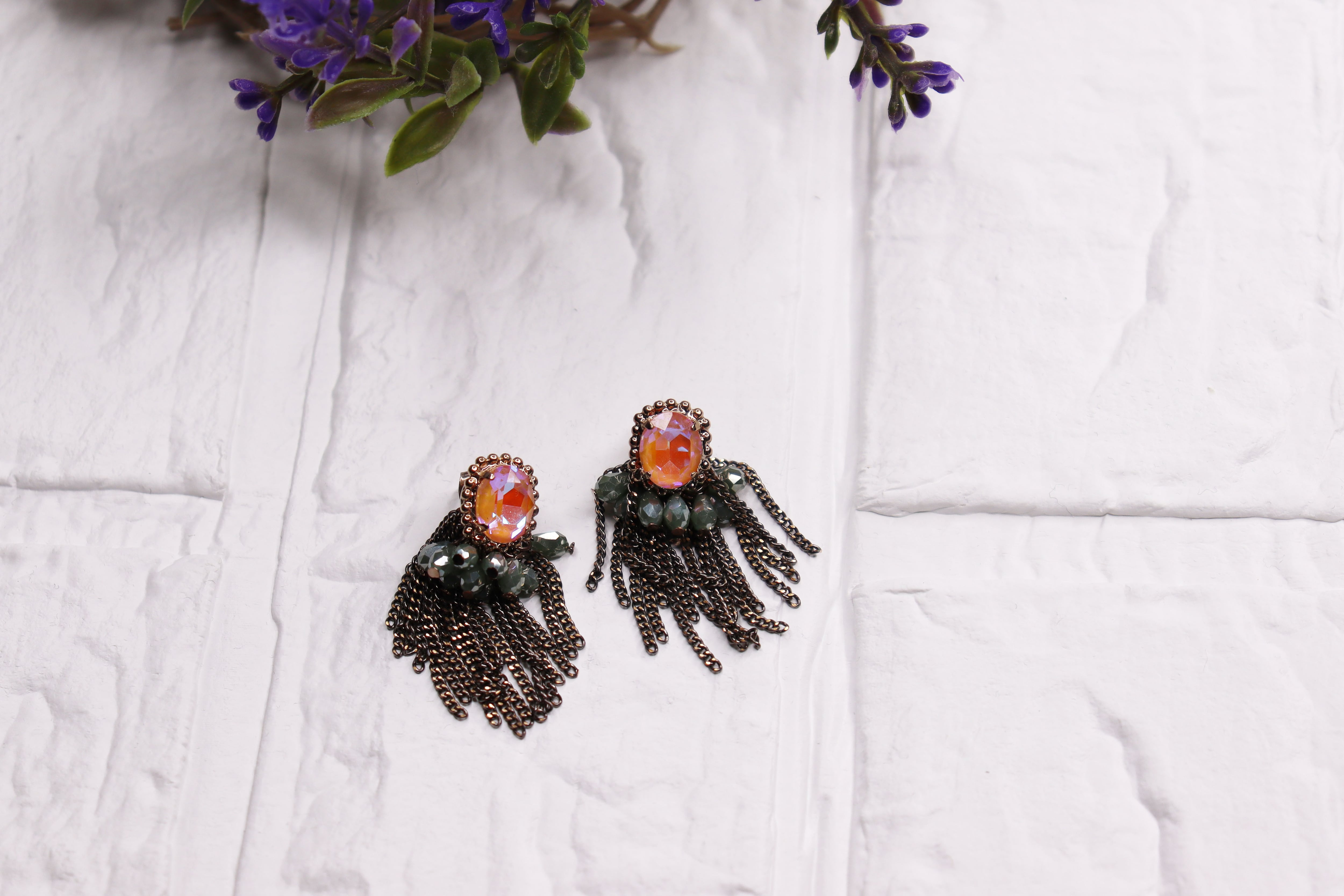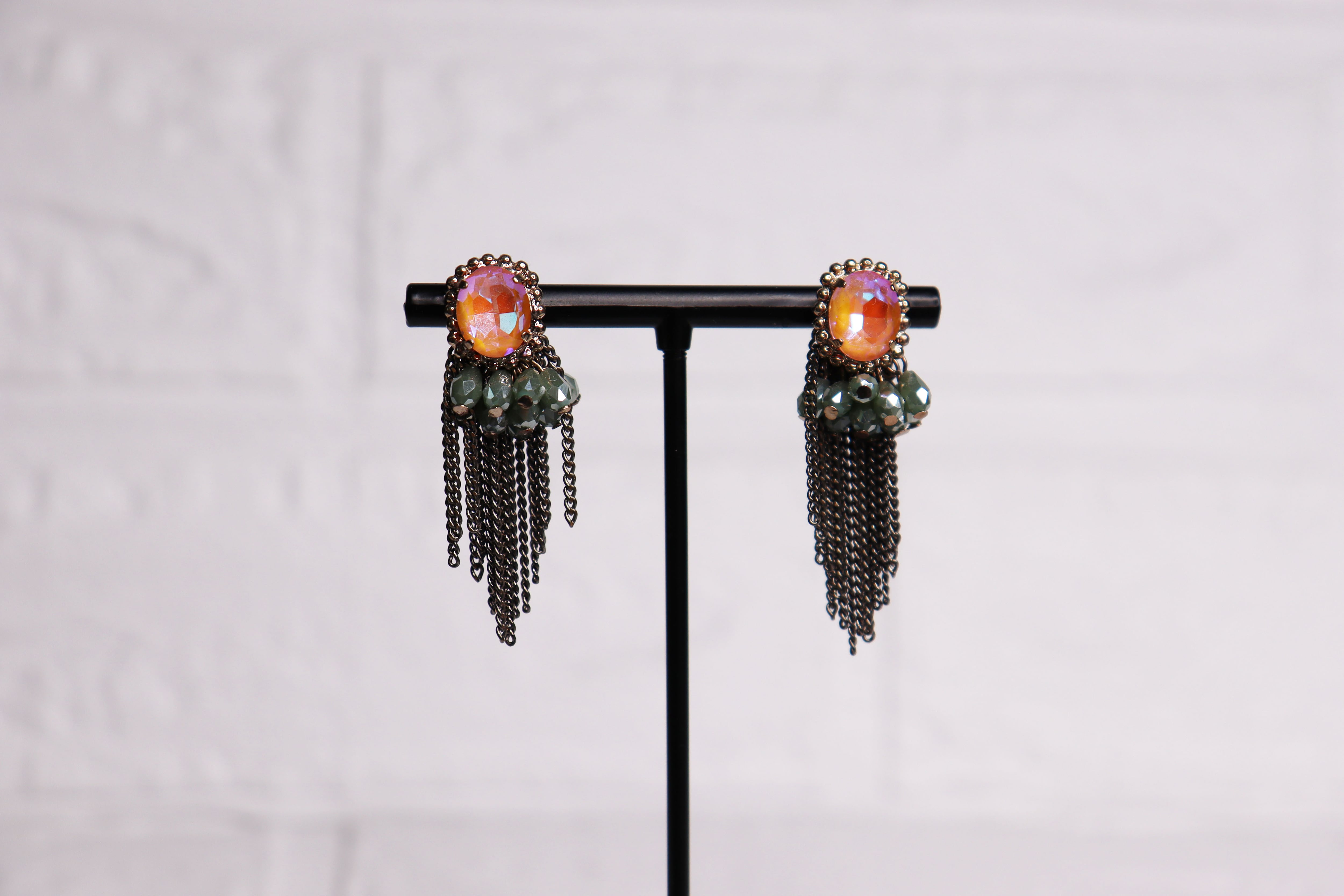 輝くオレンジのオーバルストーンと深みのあるグリーンビーズ、そして動きのあるチェーンフリンジが特徴の「アンティークブロンズ&オレンジオパール」。洗練されたデザインが耳元を華やかに彩り、特別なひとときを演出します。