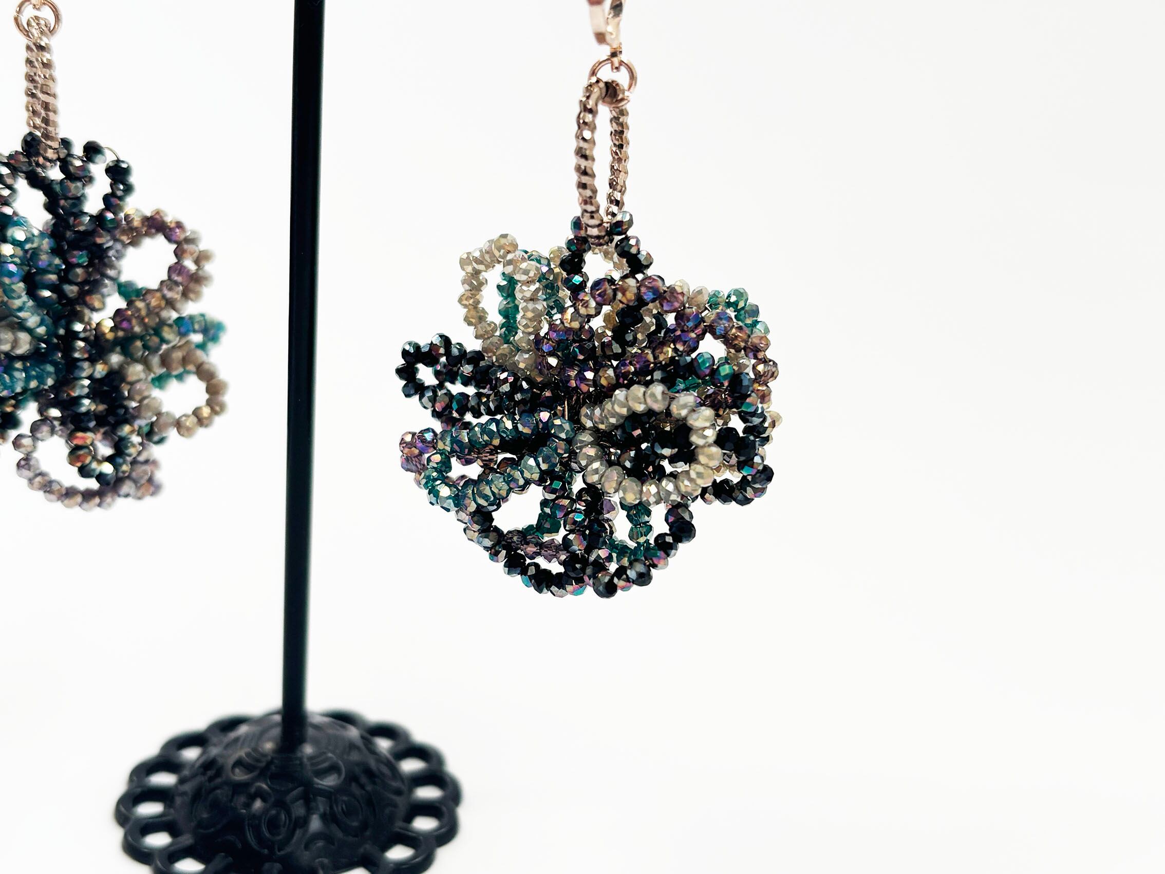 多色のメタリックビーズを立体的に編み込んだ、唯一無二の造形。